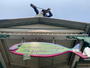 Il y a un violoneux sur le toit. Devant, un canot géant sculpté à la chainsaw dans une seule pièce de bois avec 5 passagers à son bord. Il y a des moutons faits en assiettes de métal dans le gazon, et même une sculpture de Guy Lafleur, gloire du village voisin de Thurso, portant fièrement son numéro 10, sur la galerie.