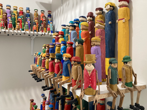Parlons-en d’ailleurs des œuvres, à commencer par celles de Raymond Leroux (1935-2024). Cet ancien preneur de son a un jour repris l’idée de son grand-père et s’est mis à fabriquer des petits personnages en bois. Il en a fait des centaines, souvent articulés, toujours colorés. Un vrai de vrai gosseux! C’est émouvant de les voir tous au garde à vous, du plancher au plafond.