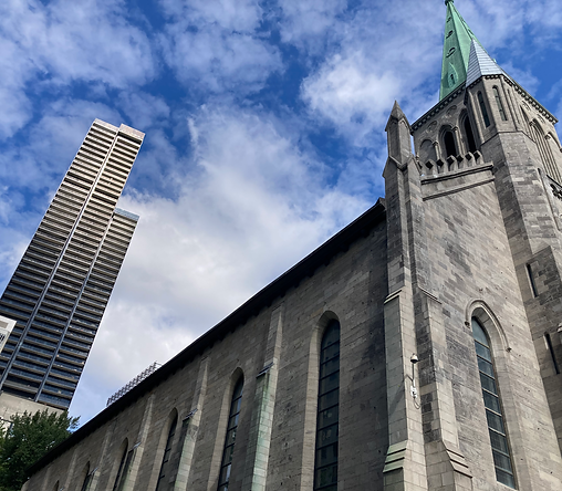 Étrangement, l’adresse est le 454 René-Lévesque Ouest, angle Saint-Alexandre, mais le majestueux lieu de culte tourne le dos au grand boulevard. L’entrée donne plutôt côté sud, sur De La Gauchetière qui se trouve en contrebas. Il y a bien un escalier qui mène à la rue, mais il est condamné.